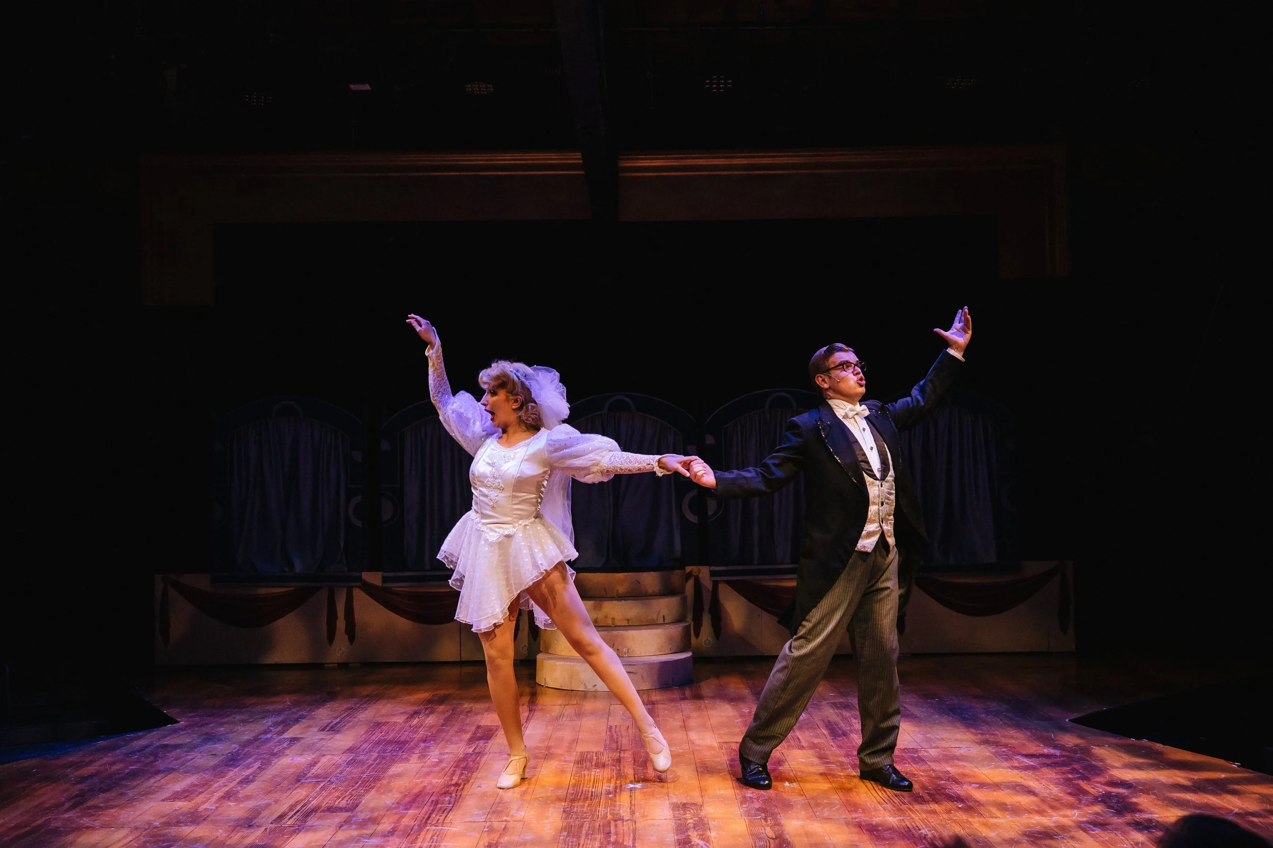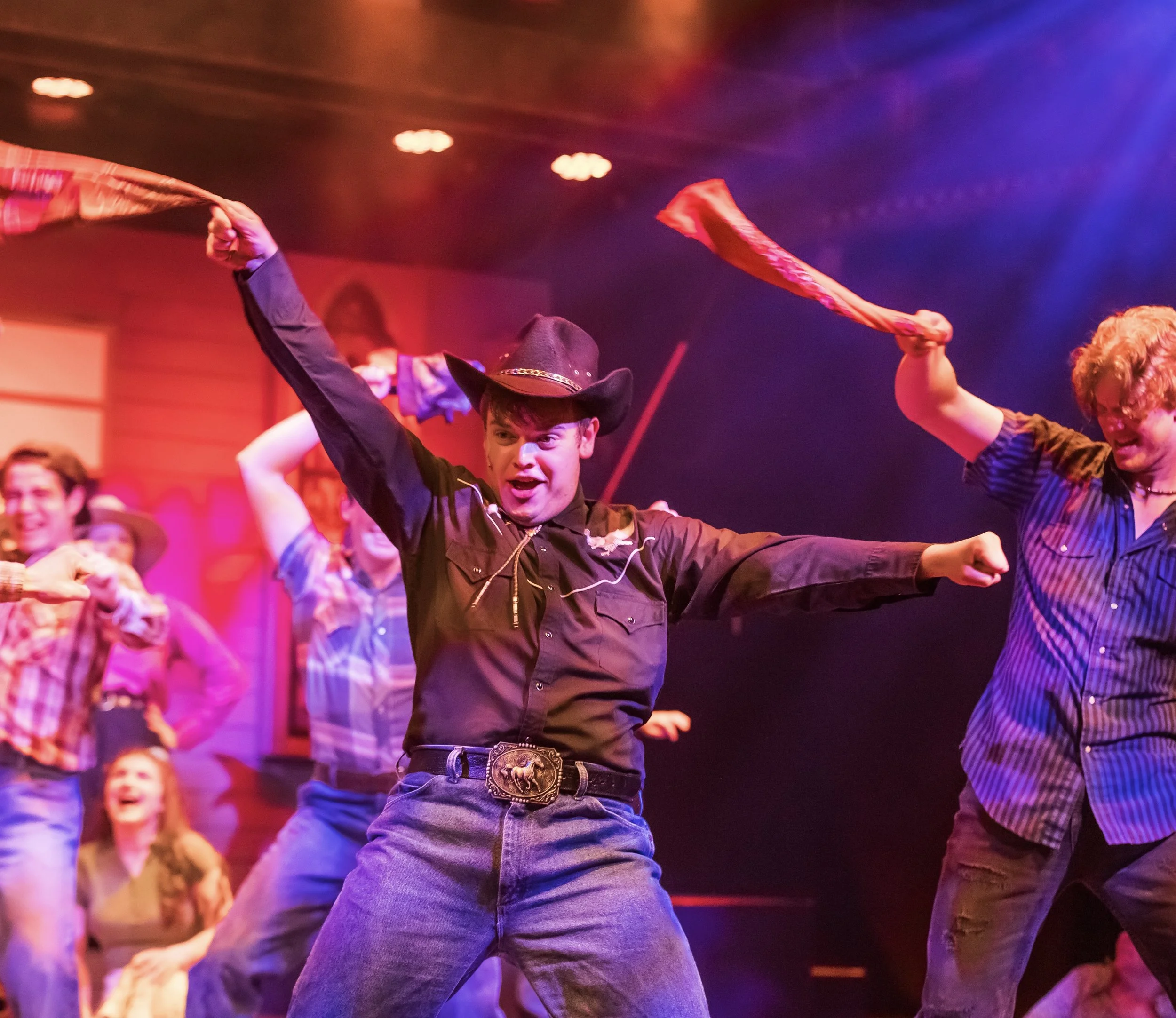 “In his turn, Jake Koch embraces his moment in the limelight, leading the players in a raucous and rousing “We Beseech Thee”, as the “goats” doomed to damnation for their earthly transgressions beg for mercy. Koch has a voice that no doubt reached the heavens with his appeal. Bravo, Sir, for giving goats everywhere the chance they deserve for repentance.” “Thank Kristen Clark Bielefeldt and Jake Koch for their spot-on turns as almost “2nd Banana” comic relief as co-writer and producers Maggie Jones and Bert Barrie. Their antics in “Shuffle off to Buffalo,” a marvelously staged number featuring the women of the ensemble and a most imaginative Pullman train car set piece, are delightful moments of broad comedy, coupled with fine singing and some pretty fancy footwork.”